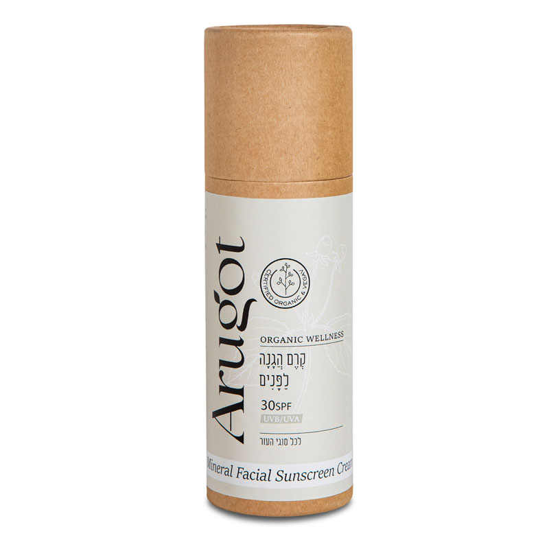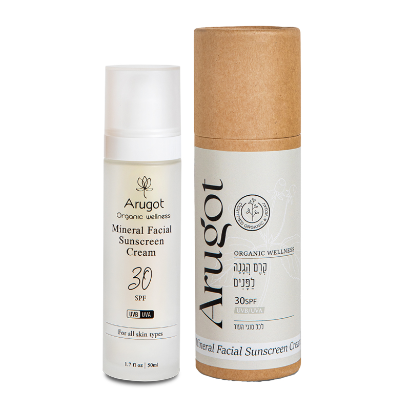 קרם הגנה טבעי אורגני לעור הפנים – בעל מסנן קרינה SPF 30. מגיע באריזת זכוכית אקולוגית. קיים באריזה מותאמת לנשיאה בתיק (אותו פורמולה וכמות).